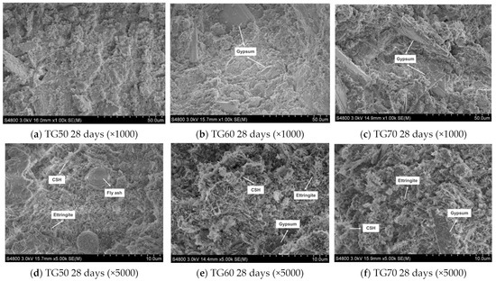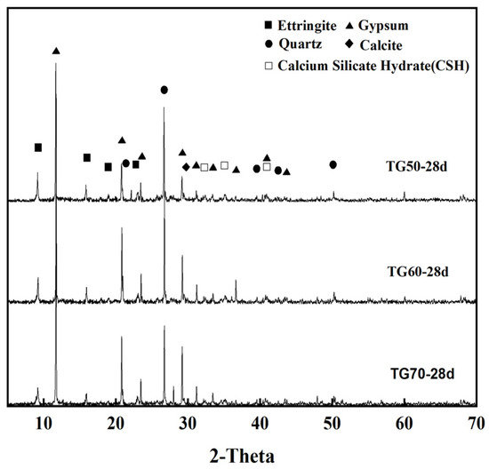 Figure 22 presents the XRD diffraction patterns of samples with TG contents of 50%, 60%, and 70% (i.e., TG50, TG60, and T70) after 28 days of curing. These samples were prepared with a constant water-to-binder ratio of 0.46 and 5% quicklime addition. The XRD analysis reveals that the primary hydration products in the CLSM at 28 days are ettringite, calcium silicate hydrate (C-S-H), and some residual gypsum crystals, which are similar to the results of existing literature [3,38]. It is evident that the gypsum diffraction peaks increase significantly with the rise in TG content, indicating that only a portion of the TG participates in the reaction to form ettringite, while a substantial amount of unreacted TG fills the voids in the system. Concurrently, the diffraction peak of ettringite shows a decreasing trend with the increase in TG content. This trend is attributed to the reduced relative content of GGBS and fly ash, which are the main contributors to the hydration reaction and the formation of ettringite. Consequently, the amount of hydration products formed within the hardened paste decreases, leading to a reduction in the compressive strength of the CLSM samples.