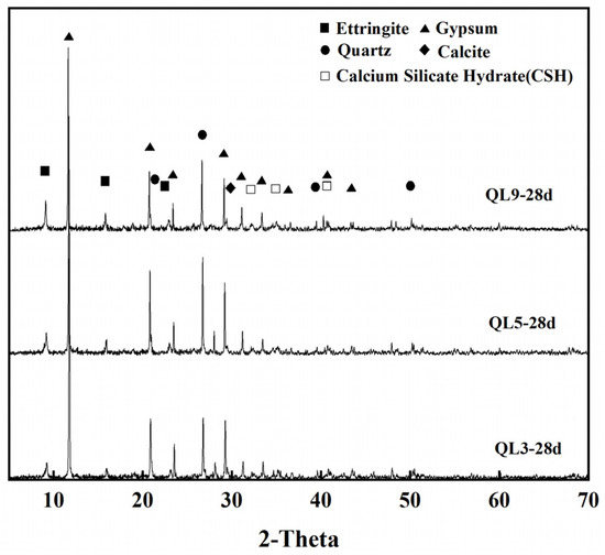Figure 24. XRD patterns of QL3, QL5, and QL9 at 28 days.