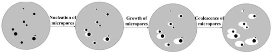 Ductile fracture easily occurs when metal materials are subjected to large plastic deformation. Before the material breaks, due to the action of the load, the internal structure of the material will change, and the appearance of tiny holes, cracks, and other defects will gradually deteriorate the performance of the metal material; these tiny defects constitute damage, and when the damage accumulates to a certain extent, it will lead to the failure of the metal material fracture. The formation process of cracks mainly includes the nucleation, growth, and coalescence of the initial pores, as shown in Figure 1.
