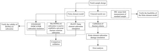 Based on the above research, in this paper, a variety of notched tensile samples were designed, and unidirectional tensile tests were carried out. DIC technology was used to measure the strain field of standard samples. The finite element simulation model of notch sample was performed, and the experimental results were compared with the simulation results. The feasibility of the finite element model was verified by the DIC analysis results and the tensile test results of the notch sample. The finite element subroutine of the fracture criterion with universal applicability was established, and its correctness verified by the three-point bending method. In this paper, different fracture criteria are used to evaluate different tensile samples, and error analysis is carried out to match the appropriate fracture criteria for different samples. The technical flow chart for this paper is shown in Figure 2.