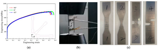 In order to analyze the mechanical behavior of tensile samples under different stress states from plastic deformation to fracture, uniaxial tensile tests were carried out on the DB sample, CH05 sample, NT20 sample, PST sample, and SH sample. The test is carried out on an electronic universal test machine, which drives the sample until it breaks. All tests were performed at room temperature. DB samples with rolling directions of 0°, 45°, and 90° were cut for the uniaxial tensile test, and the stress–strain curves are shown in Figure 3a. It can be seen that SUS304 stainless steel does not show an obvious yield platform, and the difference in the strain hardening curve in all directions is not significant; it can be assumed that the plate conforms to isotropy. The thickness of the tensile sample is 3 mm, the tensile rate is 3 mm/min, and the length of the standard distance segment is 50 mm. The process and results of the tensile test are shown in Figure 3b and Figure 3c, respectively.