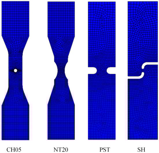 Finite element models of four kinds of samples were established. Element No. 7 was used for mesh division; local deformation areas were refined for mesh. The method of mesh refinement means that the closer the deformation area is, the greater the number of seed points corresponding to it. The bottom of the sample was fully constrained. The model was established as shown in Figure 4. The material model adopts the SWIFT model, the fitting formula is shown in (14), and the correlation coefficient is 0.99996, indicating a good fitting effect.