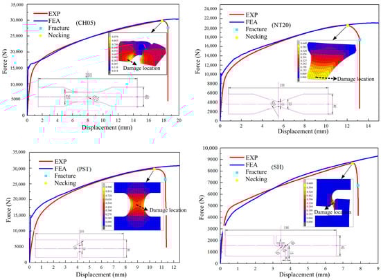 According to the simulation results, test data, and crack initiation location in Figure 6, the split point between the test curve and the simulated force path curve was taken as the start time for crack initiation [31], and different damage criteria were calibrated. The first seven criteria had fewer parameters and were easy to calibrate, and the PST tensile sample was used to calibrate the first seven criteria. The L-H and H-C criteria require at least three samples to complete the calibration. Based on the three samples PST, SH, and NT20, the mean stress triaxiality and mean Lode angle parameters are used to solve the problem, and the specific results are shown in Table 2.