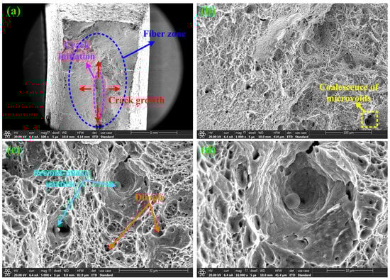 The fracture of the DB sample was observed using the scanning electron microscope. The surface morphology of the fracture is shown in Figure 7. From Figure 7c, it can be seen that there are a large number of dimples on the surface of the fracture, and the dimples are deep. It can be seen from Figure 7a that the fiber region of the fracture is large, and the location of the crack source is determined to be in the middle region of the fracture. In addition, it can also be seen that the coalescence of microvoids is obvious in Figure 7b, and the second-phase particles are obvious in Figure 7d. According to the above characteristics, the fracture is determined to be a ductile fracture. Point scanning was performed on Figure 7d, and the EDS results are shown in Figure 8. It can be seen that Cr has a high content of chemical components. Although the fracture can provide a degree of support for the determination of the fracture location, the key problem of fracture criterion calibration is the relationship between the formation, growth, coalescence of micropores, and force curve, which has not yet been determined. At the same time, the ductile fracture criterion itself does not emphasize the microscopic process of the evolution and development of pores but pays more attention to the macroscopic mechanical performance initiated by the evolution and development of pores.