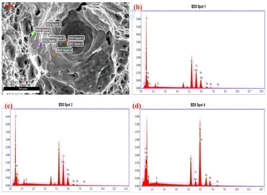EDS analysis of DB sample fracture. (a) 10,000× EDS analysis (b) EDS spot 1 (c) EDS spot 2 (d) EDS spot 4.