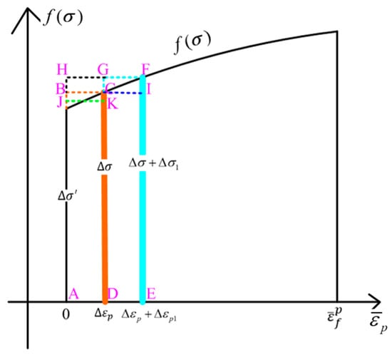 where is the yield surface; is the equivalent stress; is the yield stress; is the equivalent try stress; G is the shear modulus; is the equivalent plastic strain increment; is the initial yield limit; H is the enhancement coefficient of the linear flow model; H’ is the enhancement coefficient of the nonlinear flow model; is the plastic strain; is the elastic–plastic Jacobi matrix; is the Lame coefficient; is the K symbol; is the equivalent von Mises stress; and S is the deviatoric stress.