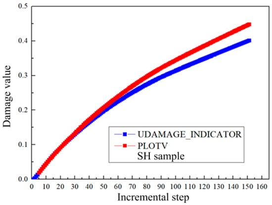 When the PLOTV subroutine is used to calculate the current stress state function value, the damage value of the first step is 0, in the second step is , and in the third step is . When the PLOTV subroutine is used to calculate the average stress state function value, the damage value in the first step is 0, in the second step is , and in the third step is . When the UDAMAGE_INDICATOR subroutine is used, the damage value of the first step is 0, and in the second step, it is . In the third step, it is . It can be seen that the difference in the three calculation methods leads to a certain deviation in the damage value. The specific geometric description is shown in Figure 9.