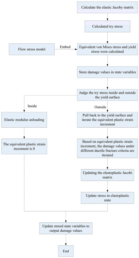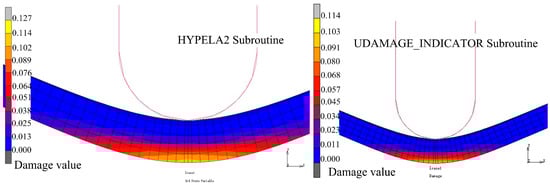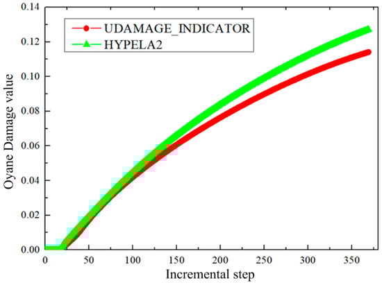 Taking the PLOTV subroutine and the UDAMAGE_INDICATOR subroutine calculated by the current stress state function value as an example, the shear sample is verified based on the Oh criterion, as shown in Figure 10. It can be seen that the calculation result of the PLOTV subroutine according to the current stress state function value is larger than that of the UDAMAGE_INDICATOR subroutine. However, only three damage criteria in MSC.MARC can use the UDAMAGE_INDICATOR damage indicator subroutine for damage value prediction. For other criteria, the limitations are relatively large. For the more accurate implementation of other damage criteria, the HYPELA2 subroutine can be used for iterative calculation. Figure 11 shows the calculation process. The damage calculation user subroutine calculation theory is as follows: