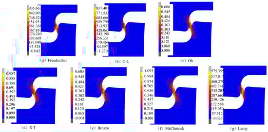 where is a function related to the stress state; is the critical equivalent fracture strain; and is the dimensionless damage threshold. When the integral term on the left side of the equation reaches , the material is considered to have begun to undergo ductile damage, and is the corresponding equivalent plastic strain in this state. As can be seen from Equation (13), the specific form of the fracture criterion expression depends entirely on the form of . Typical ductile fracture criteria (Freudenthal [20], C-L [21], Oh [22], R-T [23], Brozzo [24], McC [25], LeRoy [26], L-H [27], H-C [28]) are shown in Table 1.