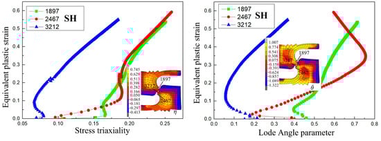 Stress triaxiality and Lode angle parameter change with equivalent plastic strain at different nodes for the SH sample.