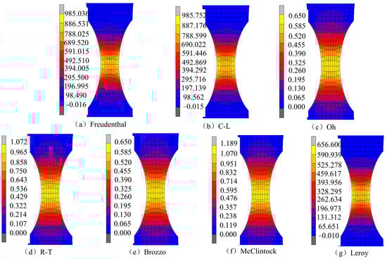 Figure 16 shows the damage value distribution for the NT20 sample under different ductile fracture criteria. It can be seen that the maximum damage value in each criterion appears in the region with the smallest cross-section area of the sample. According to the equivalent plastic strain distribution of the NT20 sample in Figure 6, the maximum strain appears at the center point of the minimum section. Combined with the change in equivalent plastic strain with the stress triaxiality in Figure 17, it can be seen that the stress triaxiality at the center point of the minimum section is greater than that at other parts of the section, and the change law is significant. Higher stress triaxiality is conducive to the growth of holes and cracks, so the maximum equivalent plastic strain point (central position point) in the minimum necking section is taken as the key point of crack initiation. All of the selected ductile fracture criteria can accurately predict the initiation location of cracks in the NT20 sample.
