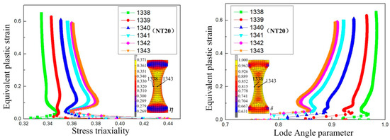 Stress triaxiality and Lode angle parameter change with equivalent plastic strain at different nodes in the NT20 sample.