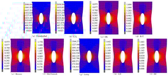 Figure 18 shows the damage value distribution for the CH05 sample under different ductile fracture criteria. It can be seen that the maximum damage value predicted by the Freudenthal criterion and Leroy criterion is located on the inner ring surface of the central hole, while the other criteria are a certain distance from the inner ring surface. Combined with the equivalent plastic strain distribution of the CH05 in Figure 6, it can be seen that the maximum strain occurs at the center of the circumferential surface. According to the variation in the equivalent plastic strain with stress triaxiality of the CH05 sample (Figure 19), material points with a certain distance from the surface of the inner ring have higher stress triaxiality than those at the center of the circumferential surface, which is conducive to the expansion of the hole. Therefore, material points a certain distance from the surface of the inner ring are taken as the key points for crack initiation [30].