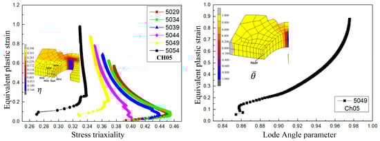 Stress triaxiality and Lode angle parameter change with equivalent plastic strain at different nodes for the CH05 sample.