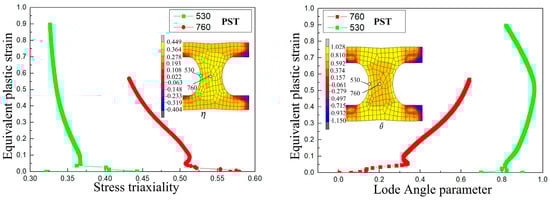 Stress triaxiality and Lode angle parameter change with equivalent plastic strain at different nodes for the PST sample.