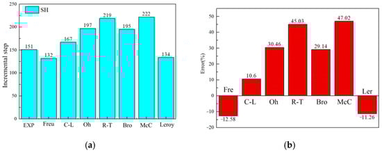 Damage initiation time for the SH sample under different criteria. (a) The corresponding incremental steps of damage appearing. (b) Damage error distribution.