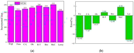 Damage initiation time for the NT20 sample under different criteria. (a) The corresponding incremental steps of damage appear. (b) Damage error distribution.