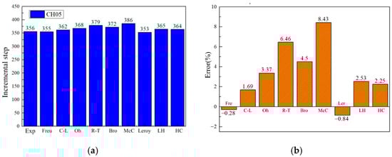 Damage initiation time for the CH05 sample under different criteria. (a) The corresponding incremental steps of damage appearing. (b) Damage error distribution.