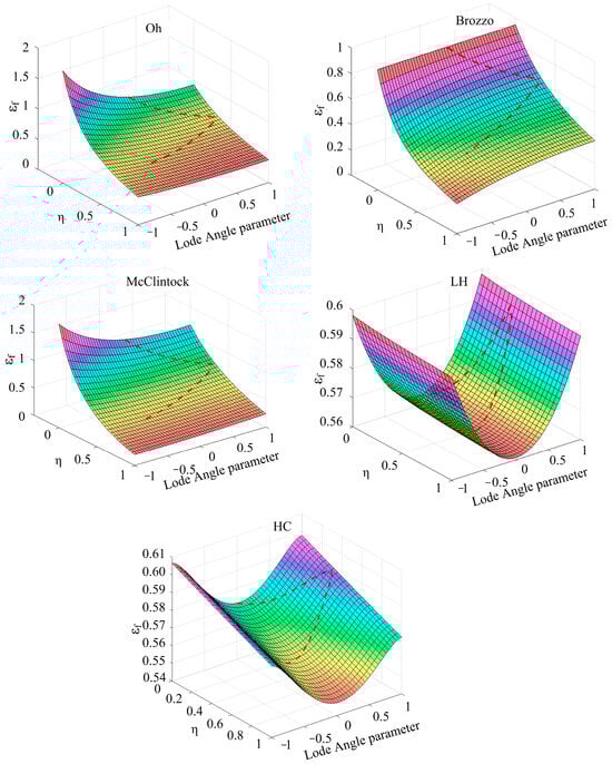 In the above fracture criteria, the fracture trajectory considering the Lode angle parameter is shown in Figure 24. It can be seen from the Oh model that under the condition of low stress triaxiality and a low Lode angle parameter, the required fracture strain value is higher. Under the condition of low stress triaxiality, the variation in the Lode angle parameter has a great influence on fracture strain. Under the condition of a low Lode angle parameter, the change in stress triaxiality has a great influence on the fracture strain. According to the Brozzo criterion, it can be seen that under the condition of a high Lode angle parameter and low stress triaxiality, the fracture strain value is relatively high. Under high stress triaxiality, the fracture strain presents a nonlinear change with the increase in the Lode angle parameter, and when the stress triaxiality transitions to a low value, the fracture strain gradually changes from a nonlinear change to a linear change. The change trend in the McC criterion is similar to that in the Oh criterion. According to the L-H criterion, when the stress triaxiality is constant, the fracture strain presents a trend of decreasing first and then increasing with the increase in the Lode angle parameter. The fracture strain distribution of the H-C criterion is similar to that of the L-H criterion.