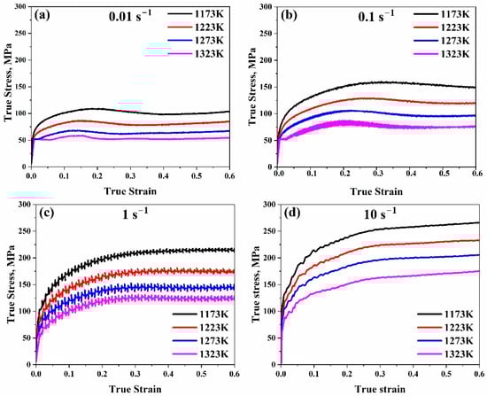 Comparison of the Trimble model’s true strain–true stress anticipated and experimental stress data at temperature range (1173–1323 K) at (a) 0.01 s−1, (b) 0.1 s−1, (c) 1 s−1, and (d) 10 s−1, respectively.