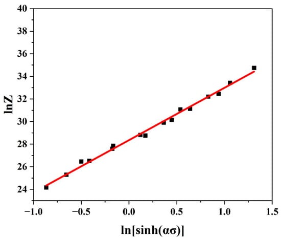 Equation (11) illustrates the temperature-compensated strain rate Z that Zener and Hollomon established. To obtain , the intercept of the linear fit of the curve was found to provide by taking the natural logarithm for each side, as seen in Figure 4, and consequently, could be estimated.