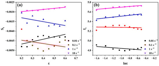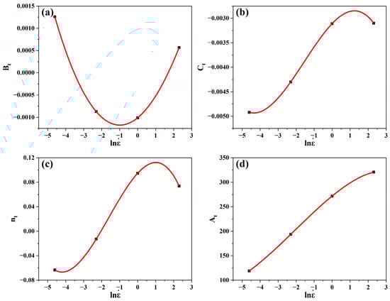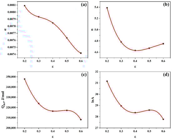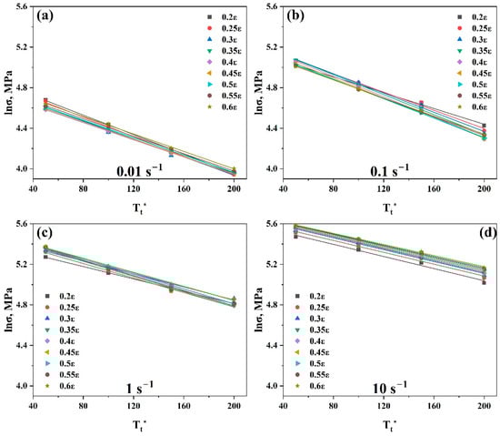 Plots of at strain range (0.2–0.6) at (a) 0.01 s−1, (b) 0.1 s−1, (c) 1 s−1, and (d) 10 s−1 to evaluate and , respectively.