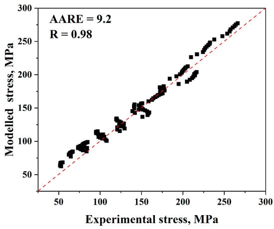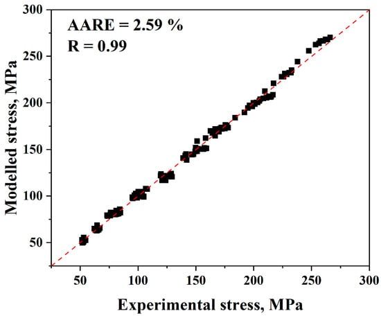 Comparison of the Arrhenius-type model’s anticipated and experimental stress data.