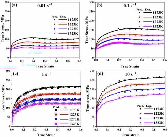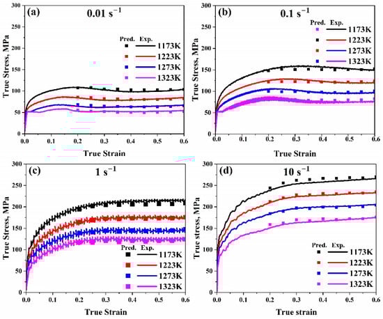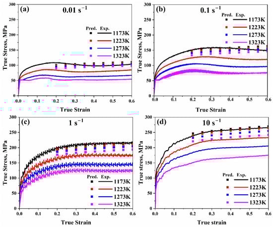 Comparison of the Arrhenius-type model’s true strain–true stress anticipated and experimental flow stress data at temperature range (1173–1323 K) at (a) 0.01 s−1, (b) 0.1 s−1, (c) 1 s−1, and (d) 10 s−1, respectively.