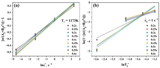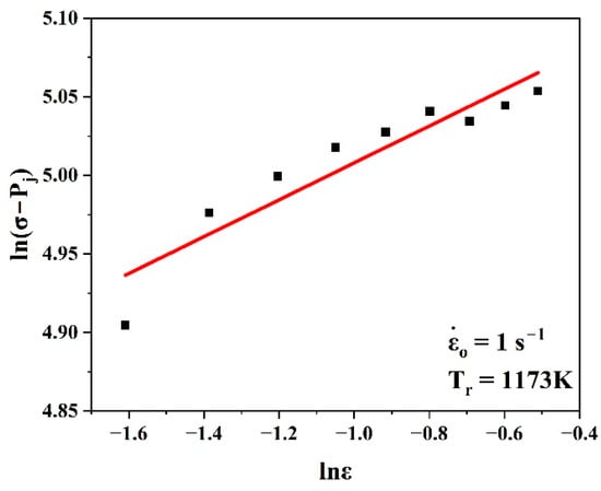 In the next step, at the reference strain rate, was estimated using Equation (23) by taking the mean slope value of the linear fit of the curve , as shown in Figure 9b. Since there are not available data at 1173 K for this curve, it was assumed that the reference temperature would be changed from 1173 K to 1123 K.