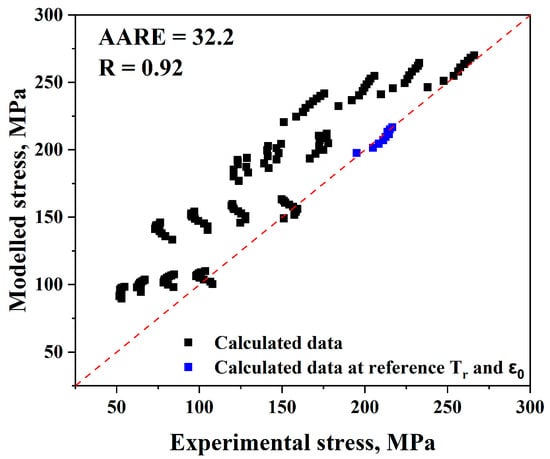 It is therefore possible to verify the validity of the Trimble model by comparing the experimental and anticipated flow stress levels using Equations (18) and (19), as shown in Figure 19. For the Trimble model, (AARE) and (R) are equal to 1.7% and 0.99, respectively.