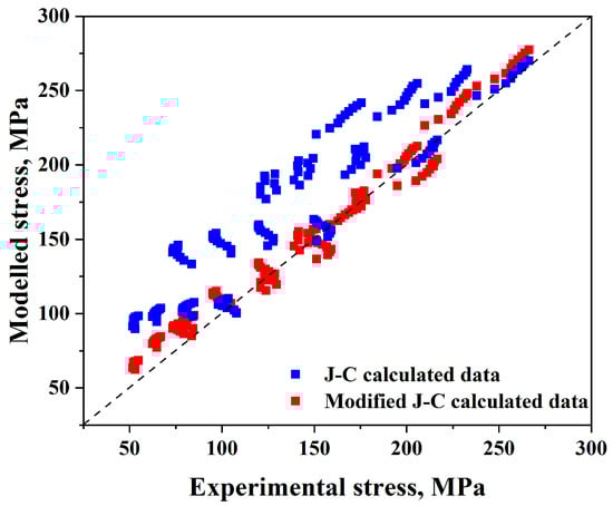 It is therefore possible to verify the validity of the Johnson–Cook model by comparing the experimental and anticipated flow stress levels using Equations (18) and (19), as shown in Figure 14. For the modified Johnson–Cook model, (AARE) and (R) are equal to 9.2% and 0.98, respectively.