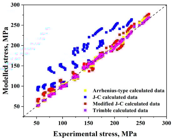 As illustrated in Figure 7, the strain–stress experimental curves could be compared with the predicted flow stress values after evaluation.