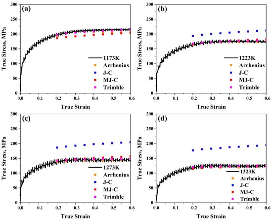 Comparison between true strain–true stress experimental curves and predicted flow stress values for the Arrhenius-type, Johnson–Cook, modified Johnson–Cook, and Trimble models at 1 s−1 at (a) 1173 K, (b) 1223 K, (c) 1273 K, and (d) 1323 K, respectively.