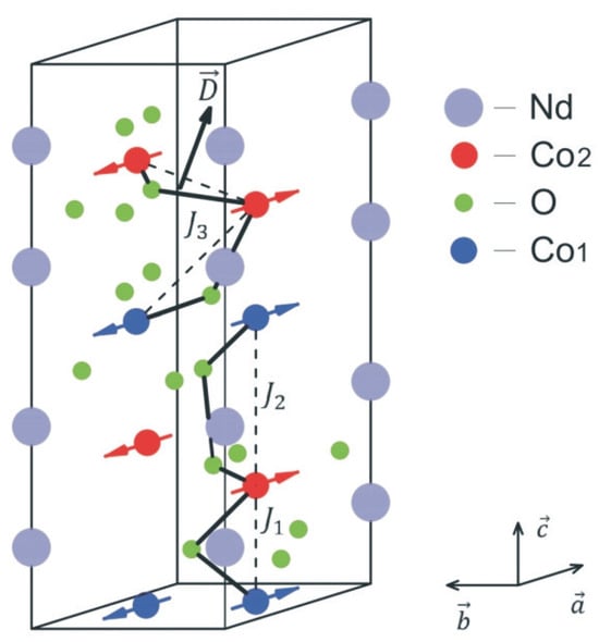 Another example of materials in the second class, where the ME coupling is linear, exhibit electric polarization only when external magnetic fields are applied. This class includes materials such as [6], [7], and (CNO) [8]. CNO has been found to crystallize in the Pc1 space group, associated with the structure, and shares structural similarity with linear ME oxides like and . CNO is an antiferromagnetic material within the family (M = Mn, Fe, and Co; M’ = Nb and Ta). In this material, dielectric anomalies and electric polarization appear near the antiferromagnetic transition temperature , but only when applying an external magnetic field [9]. Recent findings have shown that CNO possesses a high ME coupling coefficient [9,10]. The significant ME and magneto-dielectric effects observed in CNO have been linked to a spin-flop phase transition induced by magnetic interactions. The Neel temperature of this material is ≈ 28 K [9,10]. The first study reporting the effects of an external electric field on CNO’s magnetic properties was conducted by Fischer et al. [8]. In CNO, Co ions occupy two distinct sites, although there is some controversy regarding the exact nature of the magnetic configuration. Earlier research by Bertaut et al. [11] suggested a linear magnetic arrangement, where the magnetic moments of two ions are antiparallel and aligned along the crystallographic c-axis. Khanh et al. [12] demonstrated that the magnetization and ME properties of CNO do not align with a purely linear magnetic structure, proposing instead that the magnetic moments are canted within the plane at an angle relative to the c-axis. Srivastava et al. [13] provided evidence of spontaneous electric polarization in CNO, even without an external magnetic field below . Neutron powder diffraction studies by Deng et al. [14] revealed that CNO adopts a noncollinear magnetic structure, with moments oriented in the plane. This canted spin arrangement is identified as the source of the material’s strong ME coupling. It should be noted that CNO is not a highly frustrated system magnetically, and the emergence of a canting effect in the -plane is a result of the high value of the Dzyaloshinskii–Moriya interaction (DMI) [14]. A dynamic model was proposed to account for the observed spin dynamics. Theoretical investigations into linear ME coupling and the modulation of electric polarization by external magnetic fields in CNO have been conducted using the orbital model [15], symmetry analysis [16], and Hartree–Fock calculations [17].