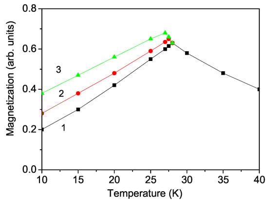 From Equation (2), we have calculated the temperature dependence of the magnetization in CNO. The result is presented in Figure 2, curve 1. It can be seen that the magnetization M increases below the Neel temperature ∼ 28 K and then decreases above with enhancing temperature T. This is a typical behavior of an antiferromagnetic compound. Let us emphasize that Fang et al. [10], Cao et al. [22], and Kolodiazhnyi et al. [9] also reported a value of ≈ 28 K, whereas Yadav et al. [23] reported a somewhat smaller value of 27.2 K for CNO. For comparison, we will also point out the values for — = 64 K [6]—and for — = 302 K [24]. Unfortunately, Deng et al. [14], who have presented a magnetic structure model, have not calculated analytically and numerically the magnetization.