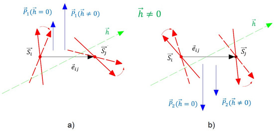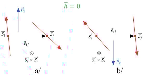 The other physical quantity which is investigated is the polarization P. As noted above, the compound CNO is antiferroelectric. In the absence of a magnetic field h, there are two sublattices with polarizations in the -plane oriented in opposite directions (see Figure 3). The calculation of the polarization in the two sublattices and is performed using Equation (8), where the total polarization is expressed as