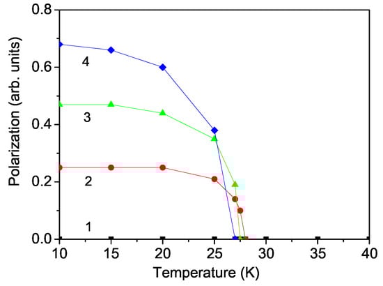 The temperature dependence of for different magnetic field values h in the -plane is demonstrated in Figure 4. In the case without an external magnetic field h, i.e., h = 0, the polarization is zero. We have an antiferroelectric behavior (see Figure 4, curve 1), due to the antiparallel spin configuration. This is in agreement with the experimental data for CNO of Deng et al. [14], Khanh et al. [12], and Fang et al. [10] for zero polarization at zero field.