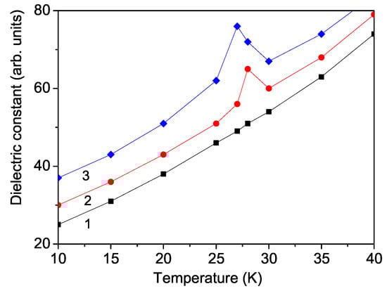 Applying an external magnetic field h, there appears a peak at the Neel temperature ≈ 28 K (see Figure 7, curve 2). Enhancing the magnetic field h, the peak increases and shifts to lower temperature values. A similar anomaly in the dielectric constant is also observed by Fang et al. [10]. It can be interpreted as a sudden change in electric polarization induced by spin rotation upon the application of an external magnetic field in the -plane. decreases with increasing h, i.e., the magnetic field tends to suppress the antiferromagnetic transition. Our results are in agreement with those reported by Mufti et al. [6] in , by Lee et al. [25] in , and by Zhang et al. [26] in .