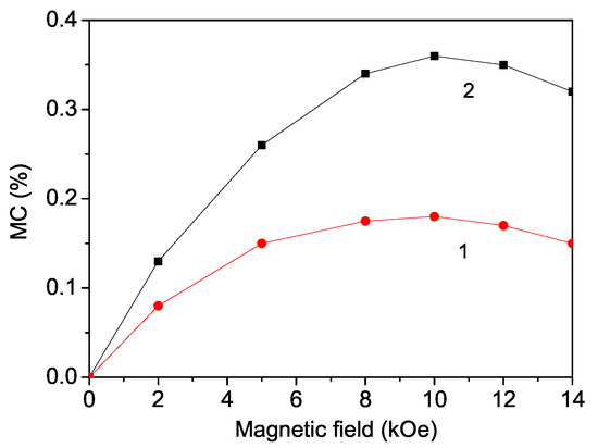 From Equation (11), we have calculated the magneto-dielectric coefficient MD(%). The results for the magnetic field dependence of the MD for two different temperatures, T = 20 and 35 K, are presented in Figure 8. It can be seen that the MD firstly increases and then begins to decrease with enhancing the magnetic field h. This increase is stronger for higher temperatures T (see Figure 8, curve 2). The observed behavior of the magnetic field dependence of the magneto-dielectric coefficient MD(h) is in analogy with that of the magnetic field dependence of the polarization in CNO.