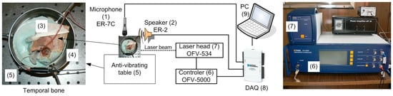 The artificial canal was sealed with a glass plate, forming a sound-sealed chamber. Reflective tape pieces, each weighing less than 0.05 mg, were strategically positioned on the footplate of the stapes. Subsequently, the temporal bone specimen was embedded in dental cement to fix in the temporal bone holder by Storz. This cement did not interfere in the experimental results because it was used outside the measurement area, and it was only used to fix the temporal bone. Measurements were conducted on an anti-vibration table within a sound booth. Middle ear stimulation involved applying a discrete chirp signal with a frequency range from 0.25 to 8 kHz to capture the ear characteristics within the hearing range. Similar setups for the measurements, as well as experimental results, are shown in [17,18].