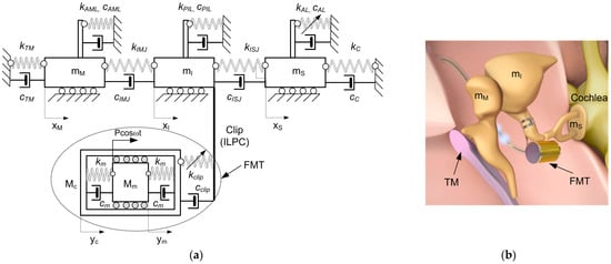 (a) A 5-DOF LPM with a floating mass transducer and mechanical excitation; (b) view of the implanted human middle ear [www.medel.pro].