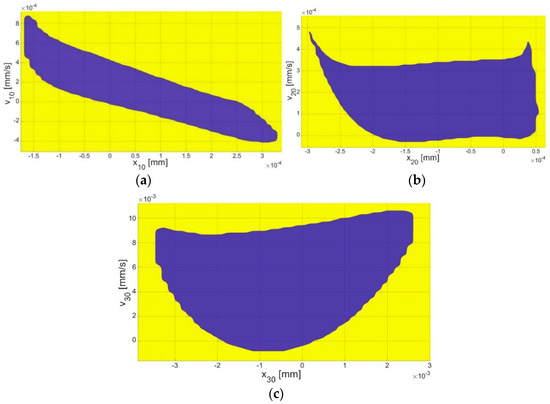 Numerical calculations of the basin of attraction (Figure 4 and Figure 5) were conducted for frequency ω = 2.5 kHz. Each mass was examined for their initial conditions. The magnitude of the initial conditions for the first (x10, v10) and second (x20, v20) mass (Figure 4a,b) corresponding to the malleus and incus was at the order of 10−4 mm, while, for the stapes (Figure 4c) (the third mass, x30, v30), it was at the order of 10−3 mm. In the case of the FMT mass (Figure 5a,b), the magnitude of the initial conditions (x40, v40 and x50, v50) was also around 10−3 mm. For the implant, the velocity-related initial conditions were of the same order, 10−3 mm, while the displacement-related initial conditions were at the order of 10−4 mm.