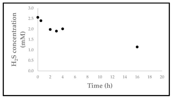 In line with German regulations on spas and water used for human maceration, a detailed analysis of such natural waters must be performed regularly, and the relevant information from the latest certified analysis carried out by Laborunion Prof. Höll & Co. GmbH, Bad Elster, Germany in 2018 is therefore provided in the Supplemental Information. Unlike this certification analysis, the analysis performed as part of this study focuses on the ingredients relevant for the subsequent chemical reaction, which are in line with the certified values as far as sulfide content (2.4 mM) and pH value (6.6) are concerned. Notably, whereas the pH is stable for days, the sulfide content decreases slowly over time, mostly via the escape of H2S, which, for instance, is able to diffuse through such plastic containers (Figure 1).