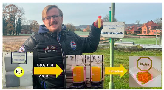 SeO2 (1.33 g, 12 mM) was added to the stirred solution of 10 L of sulfide-rich water (24 mM of H2S) previously acidified with concentrated hydrochloric acid (HCl, 37%, 4 mL), which adjusted the pH of the reaction mixture to 4.0. The reaction mixture was stirred for two hours at room temperature to obtain an orange precipitate, which was then collected by vacuum filtration. The precipitate was washed with distilled water (100 mL) to remove any unreacted SeO2 and traces of spring water. The product was dried at room temperature and stored in the dark until further use. The filtrate was used further, as described in Section 3.4.