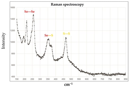 In order to confirm the presence of a genuine selenium disulfide compound, and not simply that of a physical mixture of elemental selenium and sulfur, Raman spectroscopy was employed, and it confirmed the presence of Se-Se, Se-S, and S-S bonds (Figure 3). Based on the Se-S ratios, which were also found by EDX (Table 3), and under the assumption that the material consists of eight-membered rings, finding a plethora of structures in the “circle of eight” was possible, and indeed likely, especially Se2S6 and Se3S5 rings.