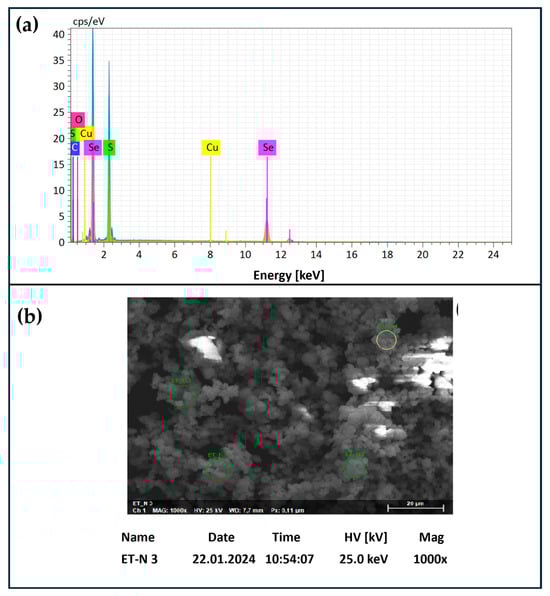 Upon formation, samples of SeS2 particles were analyzed by Dynamic Light Scattering (DLS) using a Zetasizer, which confirmed the formation of a precipitate with an average particle size of around 1 µm in diameter (PDI = 0.180) after one hour of reaction, which continued to increase over time. Notably, the Zeta potential, indicative of the surface charge of the particles, was around −4.77 mV, which may also explain why the material tended to aggregate and precipitate from the solution rather readily. To confirm these DLS measurements and to evaluate the elemental composition of the precipitated materials, SEM, in combination with EDX (Figure 4, Panel a), was utilized and indicated the presence of small globular selenium disulfide-rich objects, with sizes in the high nanometer to low micrometer range (Figure 4, Panel b).