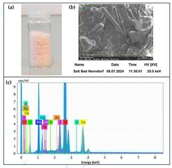 The spring water from Bad Nenndorf is not only rich in H2S but also contains high percentages of salt, namely NaCl. The Mediterranean Sea’s surface water, for instance, comprises around 12.3 g L−1 of sodium, which is remarkably similar to the water sample from Bad Nenndorf, with a sodium content of 12.2 g L−1 (Table 2) [32]. Therefore, the filtrate of the reaction was collected and evaporated in an oven at 50 °C until dryness. A total of 25 mL of this filtrate yielded approximately 3 g (12% w/w) of salt (Figure 5).