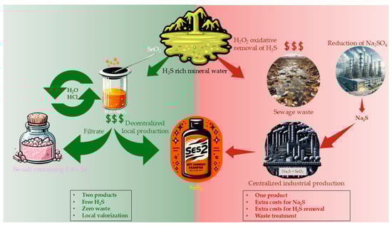 Economically speaking, solely using mineral water from Bad Nenndorf for the large-scale production of SeS2 is, of course, not possible. Here, other richer, more concentrated sources need to be considered, such as the Solec-Zdrój “Malina” spring in Poland, where over 400 kg of H2S can be harvested annually, considering a theoretical flow rate of 1 L min−1. This natural source may be sufficient to replace Na2S, which has a cost of several hundred Euros per ton. Then again, small(er)-scale local production in spa towns with similar mineral springs to Bad Nenndorf, such as Aachen or Bad Wiessee in Germany, may still be attractive, as it could empower local communities and contribute to their overall economic development. These local natural spring spas may, for instance, launch their own proprietary cosmetic products, such as shampoos, or produce their own brands of Se salt on a commercial and larger scale; furthermore, these locations could market these products, allowing for sales to cover production costs and incentivize a small profit margin. This may support the local and regional economy around such spa towns, which are often located in rural areas. Eventually, these smaller and somewhat niche SeS2 business opportunities for small and medium-sized enterprises might become quite lucrative, considering that mineral water is often discarded as waste and must be purified, most commonly via oxidation at an added cost (Figure 6).