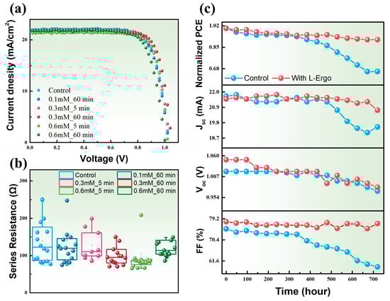 (a) The current–voltage curve of the perovskite solar cell under varying concentration and soaking duration of L-Ergothioneine. (b) The series resistance of perovskite solar cells under varying concentrations and soaking durations of L-Ergothioneine. (c) Long-term aging test of electrical properties of perovskite solar cells with and without (control) L-Ergothioneine.