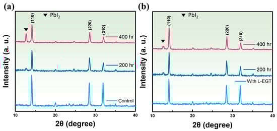 Figure 4 presents the XRD diffraction patterns, where the crystallinity and compositional changes of the perovskite film following the introduction of L-EGT can be observed. The characteristic peaks of the perovskite are observed at the (110), (220), and (310) planes, and the symbol presents the signal of the PbI2 peak. Following the incorporation of L-EGT, the diffraction pattern showed no evidence of secondary phases, and the intensity of the (110), (220), and (310) peaks was consistent with that of structure without L-EGT, suggesting that the introduction of L-EGT did not change the structure of the perovskite. Figure 4a shows the XRD spectrum of a perovskite film without L-EGT, where a significant reduction in peak intensity was observed after 200 h of aging. After 400 h, the formation of a PbI2 secondary phase was detected at 12.8°. In Figure 4b, the perovskite film incorporating L-EGT showed only minimal intensity of PbI2 secondary phase formation after 400 h of aging testing. This observation indicates that the introduction of L-EGT effectively passivated the defects of uncoordinated Pb2+ within the perovskite film, prolonging its lifetime and suppressing PbI2 formation, which contributes to the improved aging characteristics of perovskite solar cells [,]. The electron cloud density distribution of different functional groups exhibits tunable characteristics related to interface passivation. The CO group, provided by carboxyl groups, is characterized by a high electron density, allowing CO to form a stronger Pb–O coordination with uncoordinated Pb2+ double bonds. This interaction helps reduce lead-based defects at the interface. Additionally, the strong electron-withdrawing ability of CO facilitates its role as nucleation centers, moderating the growth rate of the perovskite layer and promoting the formation of a high-quality perovskite absorber layer with larger grains [,,]. The XRD reveal that the inclusion of L-EGT inhibited perovskite degradation and mitigated decline in FF for the perovskite devices.